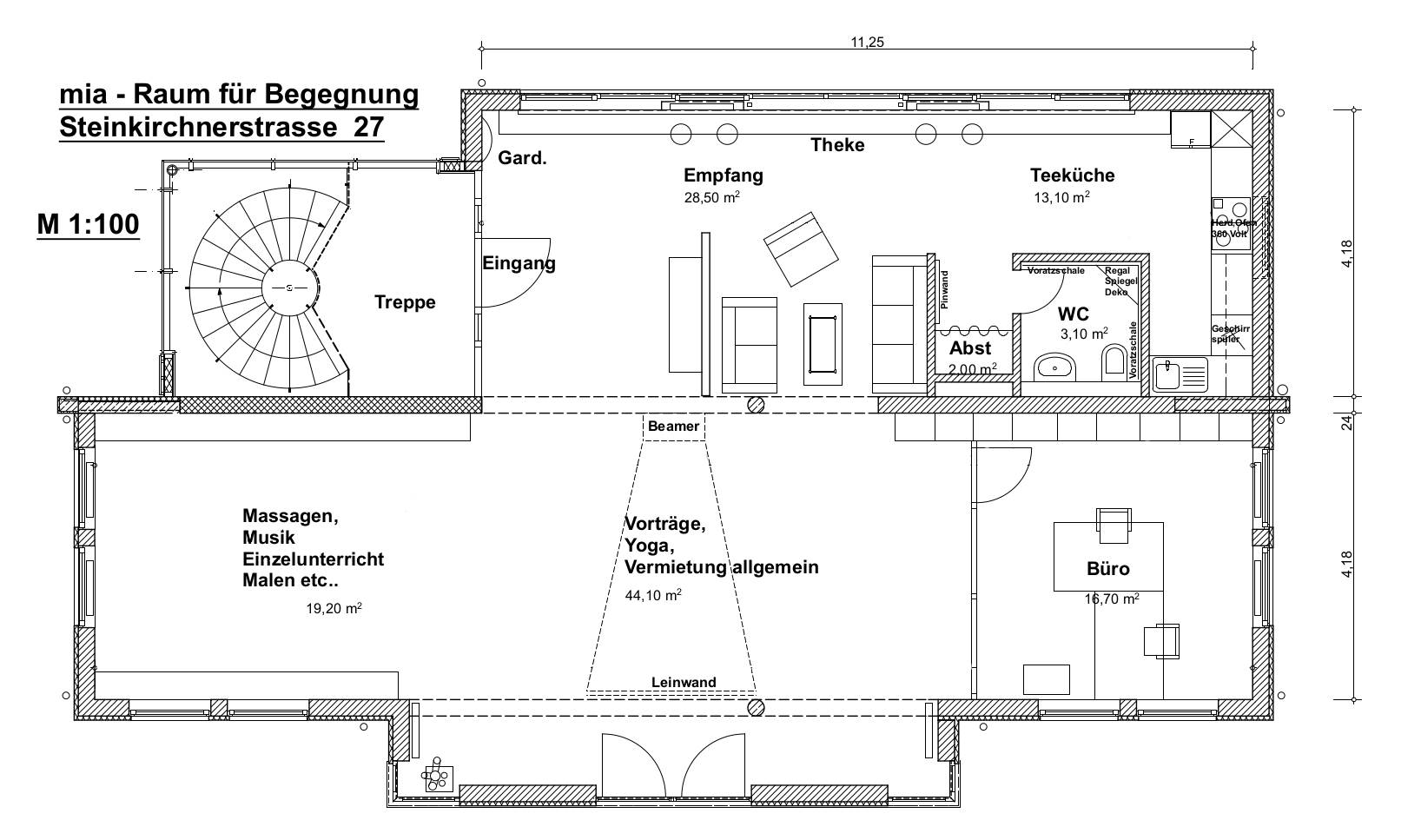 Der Raum „MIA“ befindet sich in einem rotgestrichenen Gebäude mit verglastem Treppenhaus direkt an der Endstation der Linie U3 in Fürstenried West und ist über einen wendeltreppenähnlichen Aufgang zu erreichen. Die Fenster nach hinten gehen auf den begrünten Innenhof herraus. Da die benachbarten Mieter am Wochenende und nach 19 Uhr nicht mehr im Haus sind, sind Sie bei therapeutischer Arbeit ungestört und es darf im Seminarraum auch einmal lauter werden. Der Boden ist mit Stäbchenparkett belegt. Dank der vielen Fenster ist der Raum sehr hell. Er hat eine gute Akustik und eignet sich daher auch für Musikveranstaltungen.